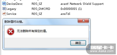 今天看到AVAST5.0,去试用了一下,发现没有瑞星好,卸载AVAST5.0后,在手动清理注册表中发现这样一项怎么都无法删除,手动不行,我用超级兔子、360、Z武器、CC清理都不能够删除,数值名称是DeviceDesc 数值数字是avast! Network Shield Support手动删出现如下图。请工程师帮助,怎样才能够将其搞掉,我有系统洁辟,不要说没有影响。