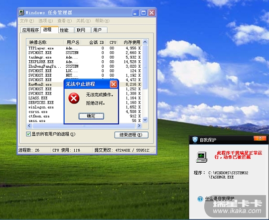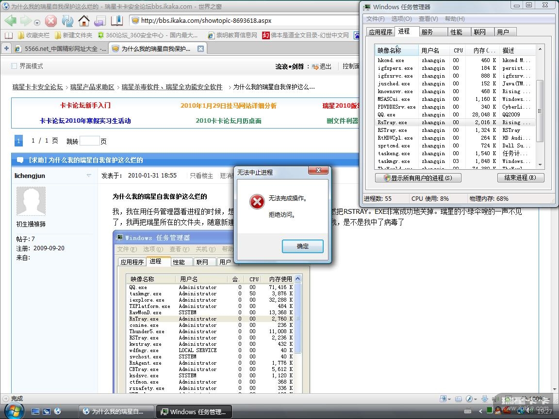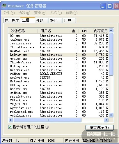 我,我在用任务管理器看进程的时候,想测试一下自我保护能力。结果竟然把RSTRAY。EXE非常成功地关掉。瑞星的小绿伞嗖的一声不见了,我再把瑞星所在的文件夹,随意新建,删除。瑞星的自我保护都没理我,是不是我中了病毒了