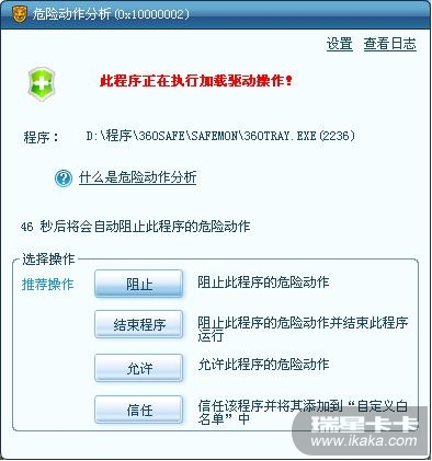 瑞星显示拦截窗口是正常行为,楼主要想正常运行360,点击信任也就是了。