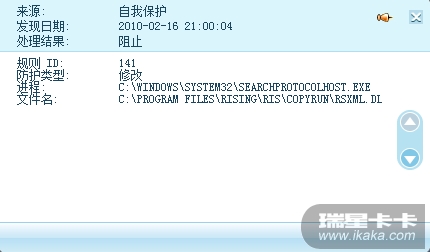 我用的是Windows 7 操作系统,安装的是瑞星全功能安全软件2010三年版的。自从打开系统搜索索引功能之后,一旦瑞星启动自动升级,自我保护规则就被触发。记录如下图。请教高手是什么原因?