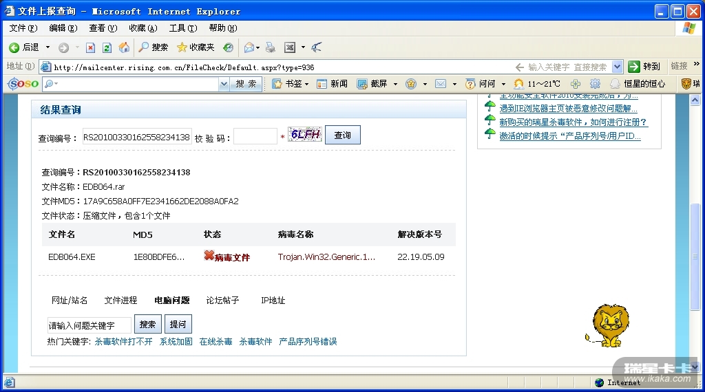 将病毒文件提交给瑞星检测吧 地址: