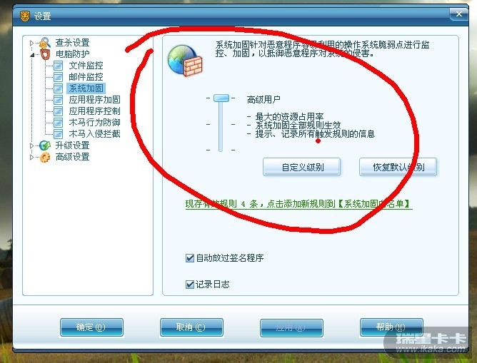 为什么我电脑上瑞星中<系统加固>和<木马行为防御>的设置经常自己会改?木马行为我设置的级别是最高,系统加固是自定义的,可视发现老是自己会改变,系统加固有时会变成级别最低,木马行为也一样,每天都会变,害的我经常要打开瑞星看一下设置变了没有,据我观察好像是瑞星每次升级后这两个设置就会变,现在我索性将系统加固的级别调成最高,懒的在自定义了否则每次变再设置一次很烦耶!!还有瑞星有没有将设置规则导出的选项,下次重装后可以将设置规则导入省的再设置一遍?