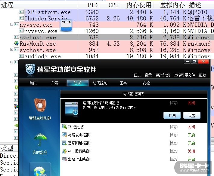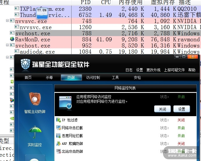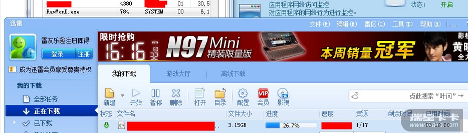 在"网络监控"里打开了应用程序访问网络监控后迅雷普通下载时Ravmond进程cpu使用率暴高,而关了应用程序访问网络后Ravmond进程最多就占用9%而以。