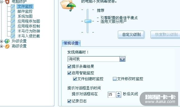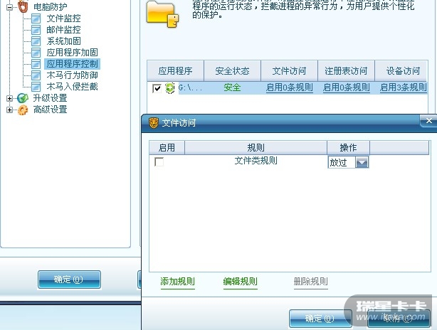 因为我工作关系,我需要远程管理我在公司电脑。可是我使用的远程管理工具被瑞星判断为木马,没办法,只好设置入白名单。就是把管理工具的服务端程序在“高级设置”——“排除查杀目标”中填加了进去!