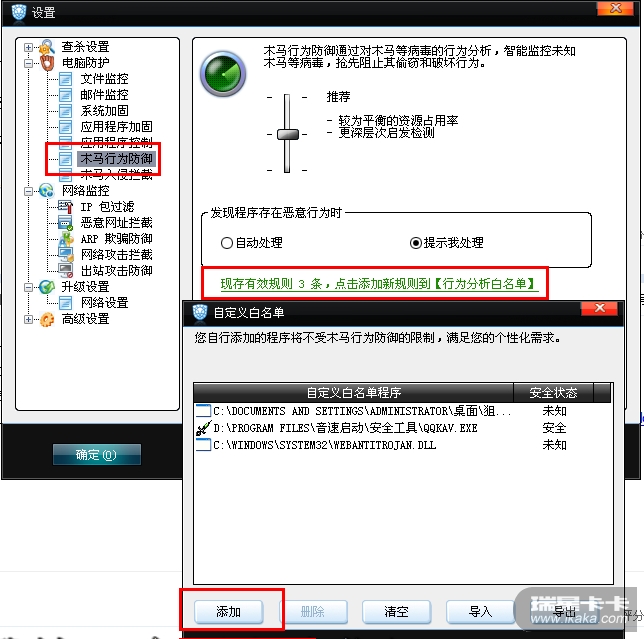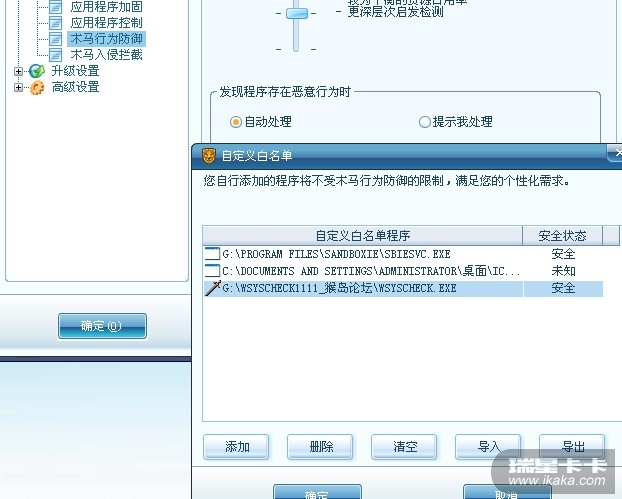 同样的白名单设置,我在360安全卫士和杀毒中,只要设置了白名单或信任程序。都可以被排除查杀(包括内存),为什么瑞星就不行呢?