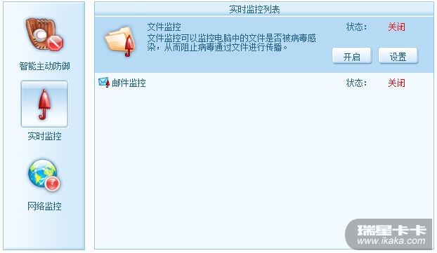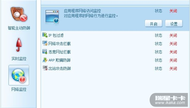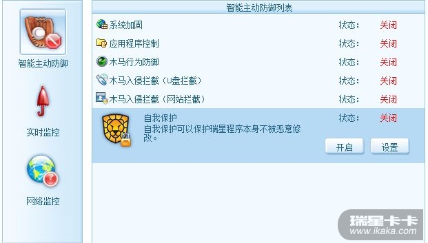 我是买的一个可以升级两年的瑞星全功能安全软件,还没到期,以前用的很好没什么问题的,但是最近我突然发现瑞星虽然显示的是小绿伞,但是仔细一看所有的监控都是关闭的,点击开启也没用,还是关闭的,有没有高手告诉我该怎么解决这个问题呀,谢谢各位了!!!具体情况如下图: