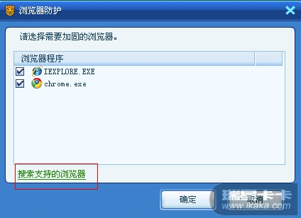 在电脑防护>>浏览器防护,点击ieexplore.exe,点击搜索支持的浏览器即可