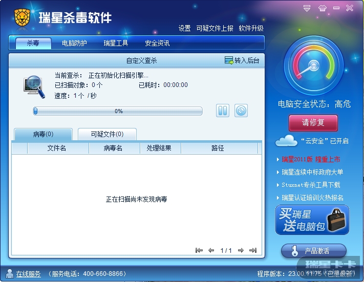 瑞星用了6年,一直都很好。但最近升级到了2011版后,在windows7系统用不了,具体表现:任务栏的伞是绿色的,打开瑞星的电脑防护后,什么监控都是关闭的状态,单击开启也开启不了,而且右键的使用瑞星杀毒也用不了,当用到自定义查杀时,永远是下面的状态