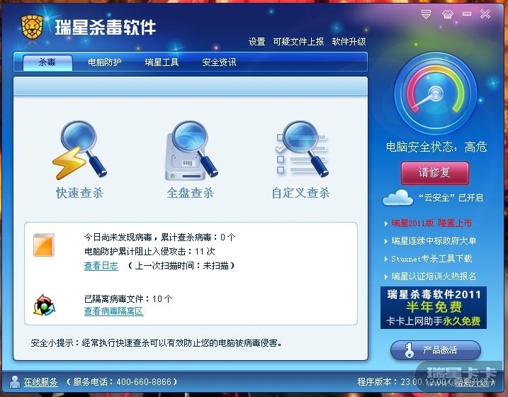 版主进来看看,瑞星杀毒软件2011,出问题,用不起来!