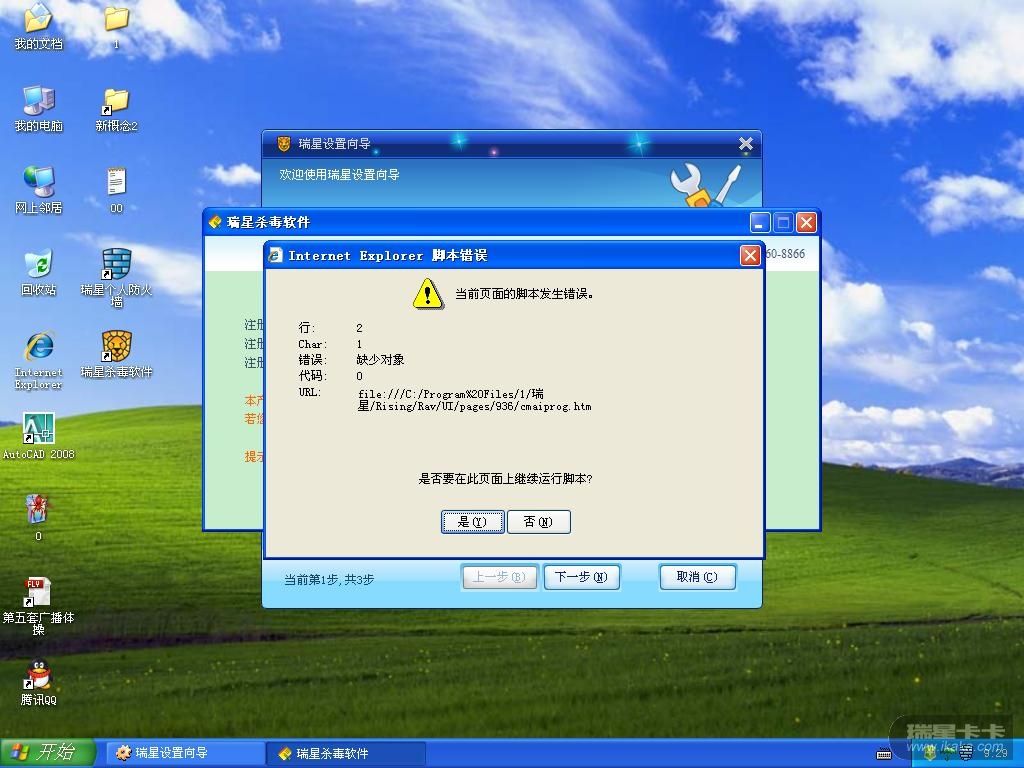 当我重新安装系统后,瑞星再次升级并重新启动后,不知道是什么原因,出现了“当前页面的脚本发生错误”。看了文件,好象是瑞星文件里面的东西。请指教是什么原因。