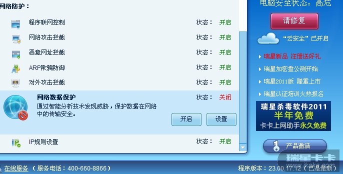 lz瑞星杀毒软件版本是多少?关闭网络数据保护功能是否正常?