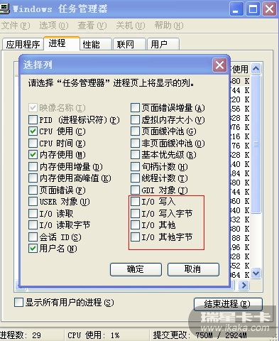 当您硬盘状态出现异常时计算机的cpu占用资源情况如何。请你调出任务管理器>>进程>>查看>>选择列,如图所示将I/O选项都勾选