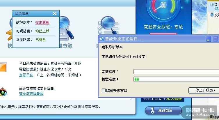 电脑重装系统,之前就用瑞星自带的安装程序制作了一个安装包,系统搞好后,安装了瑞星杀毒软件,然后无法升级,一直显示“高危状态”。一点升级,进度跳两格(这时显示“连接到瑞星升级服务器”)然后就一闪就没了。查看日志,“更新结束更新失败【11】”。