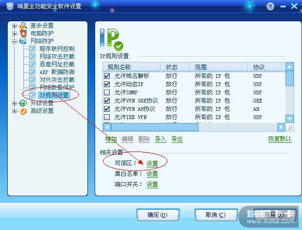 楼主可以对可信区进行设置,单击【可信区】右侧的【设置】按钮,在弹出的对话框中可以设置可信区。可信区一般应用在局域网环境。对于可以完全信任的局域网用户,为了避免防火墙带来的操作不便,可以将这些用户加入本机的可信区中。