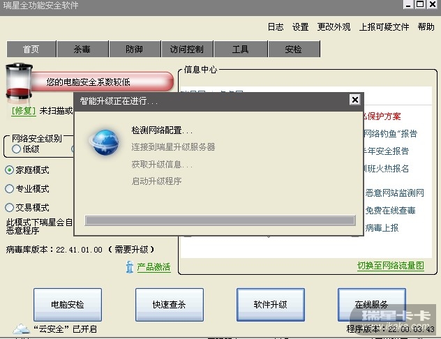 因为,要重装系统,先用瑞星打包了一个安装包,可是系统做好后,安装好瑞星后,不能升级,点升级也没有反应、、