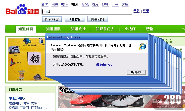 瑞星升到2011后打开IE浏览百度知道页面的时候系统100%报错程序错误,点击关闭页面就消失了