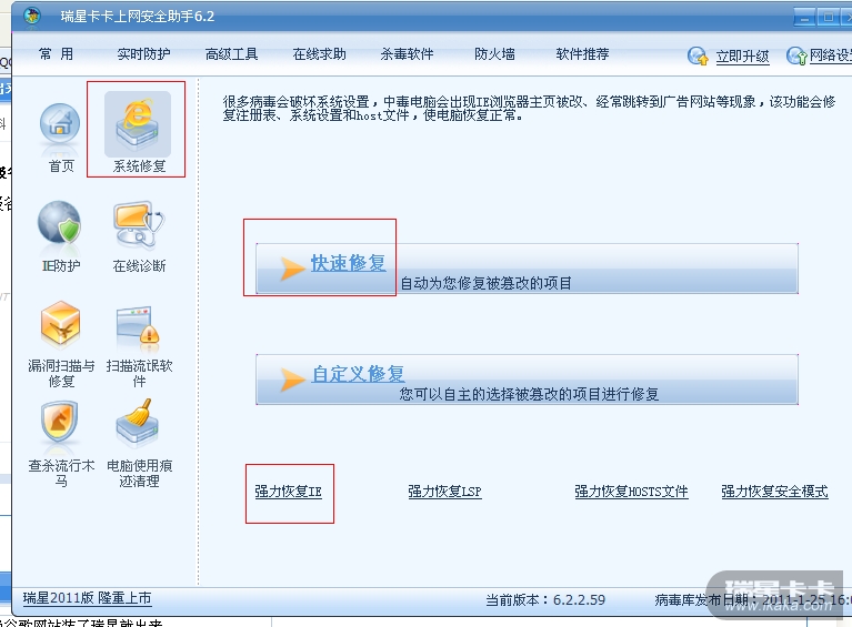 吗?如果是,请安装最新版的卡卡。然后在常用选项卡中选系统恢复,点快速修复或强力恢复IE。