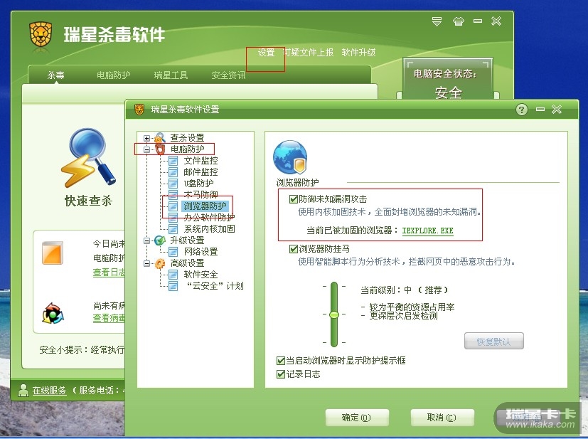 打开瑞星杀软-设置-电脑防护-浏览器防护-把“防御未知漏洞攻击”的勾去掉 如图(记得删除后重新勾选该项)