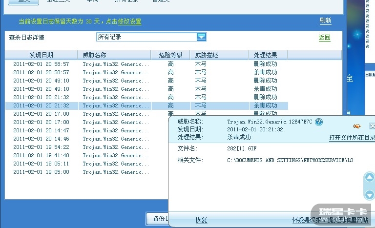 建议楼主重启电脑,按住F8,选择安全模式进入。然后用瑞星进行全盘查杀看看。