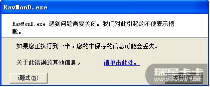 您好 RAVMOND.exe是瑞星杀毒软件相关监控程序 您的问题是瑞星杀毒程序的异常导致的 建议您修复下瑞星杀毒即可 具体是 开始菜单 所有程序 瑞星杀毒软件 修复(把保留配置文件前的勾去掉) 如若还是不行 请提供有关该错误更为详细的信息