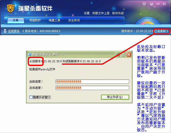 如果用户设置的是 “手动升级” 则不论贵公司目前已发布多少更新,主界面右下角都一直显示用户最后一次升级的版本并加 “(已是最新)” 字样(后附截图)。如此易误导用户致用户疏于升级。