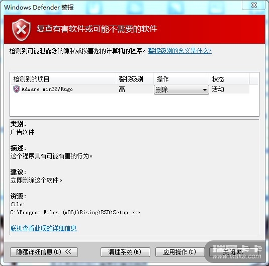 defender报我的电脑中了 Adware:win32/Rugo 病毒,可怎么也删不去,删掉,重开机就又了,在网上搜有的说是瑞星的组件,请问是吗?有谁可以告诉我!