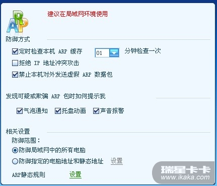 目前家中路由器在自己房中,用有线连接。。。隔壁房间使用的时无线网络连接路由器,瑞星防火墙安装在有线连接的电脑上。。。那ARP该如何设置  目前开启后,使用的是如下设置