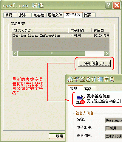 下载了离线安装包,检查其数字签名时被 Win xp/2k 提示无法验证其数字签名(截图附后),请在线工程师确认此问题,谢谢!