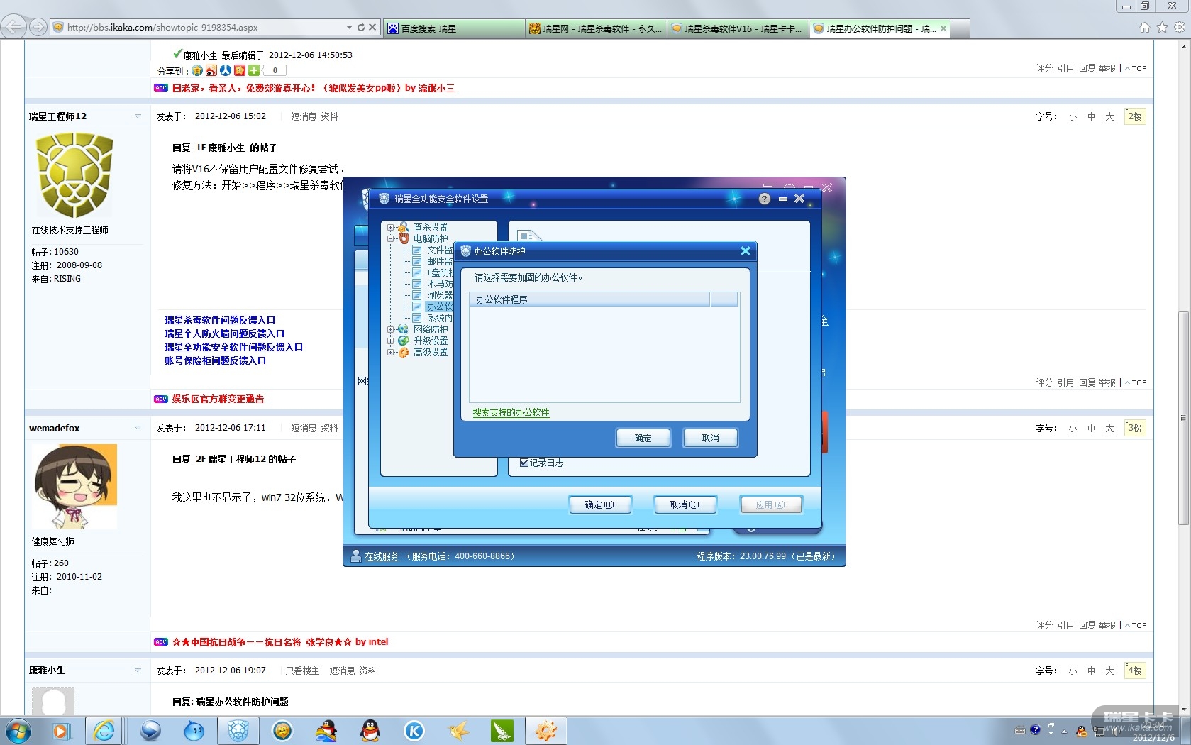 谢谢您的回复。瑞星工程师12,我这里可说的是瑞星全功能杀毒软件呀!没有说其它的吧!因为这款软件不光我在用!我只是测试到它的异常情况提交一下罢了,希望贵公司的相关工作人员能把它处理。哎呀呀!您这么让我,哈哈!其它的我也不说什么了