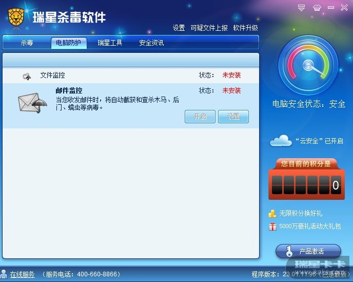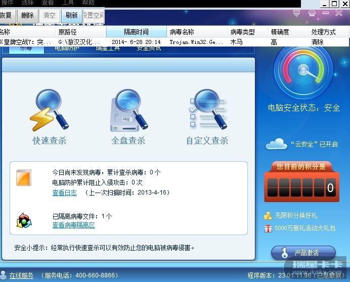 我今天升级病毒库至v23.01.11.96 系统提示需要重启机器。重启回来再次打开瑞星杀毒软件,整个界面变的扭曲不堪,功能也无法正常使用。