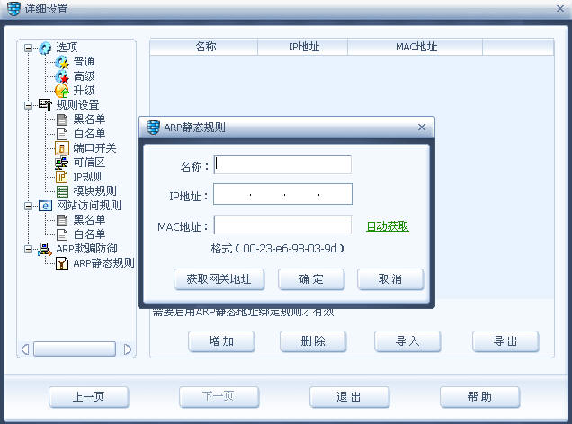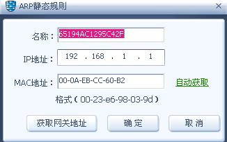 注:arp静态规则,选择“增加”里可以自动“获取网关地址”,这里不推荐使用,建议咨询网管,手动输入网关的地址,来保证其正确性。