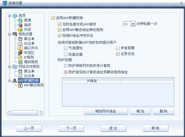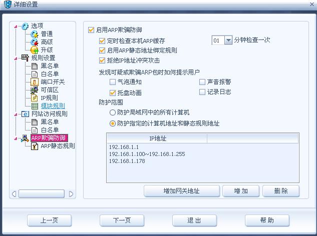 1.打开防火墙/设置/详细设置/arp欺骗防御,做如图设置: