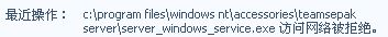 详细内容2007-12-21 06:31:14, 系统禁止本地SERVER_WINDOWS_SERVICE.EXE发送UDP数据包,地址为:0.0.0.0:8767 => 116.252.143.117:2510程序名称为:C:\PROGRAM FILES\WINDOWS NT\ACCESSORIES\TEAMSEPAK SERVER\SERVER_WINDOWS_SERVICE.EXE