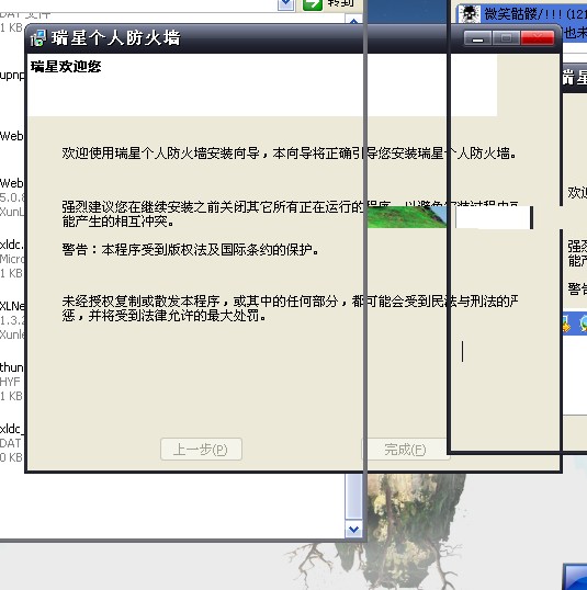 【小罗西的贴子】你好,我的杀毒软件 06年买的单机版 台式机上用没出过问题,最近我打算在我的本子上安装一下,瑞星杀毒安装上去了,防火墙却不能安装,所以我从新安装了系统,安装好系统后第一件事情就是 装杀毒软件和防火墙, 奇怪 杀毒软件还是可以安装上去 我的防火墙却不能安装,步骤如下: