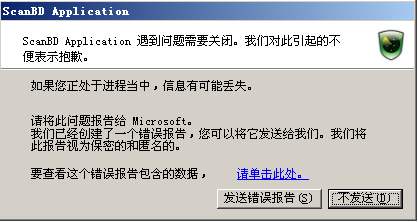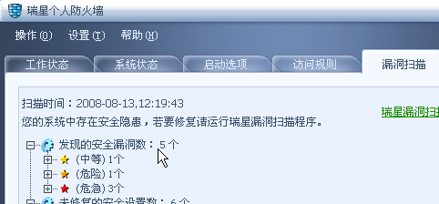 一直以来都是用瑞星防火墙的“漏洞扫描”来给系统漏洞打补丁的,但是昨天却发现已经不能用了。现象是:点击瑞星防火墙进入防火墙主界面后,再打开“漏洞扫描”标签页,当点击右上角的“瑞星漏洞扫描”时即出现如图所示的提示,关闭这个提示后就退回到瑞星防火墙的主界面而不能实现给系统漏洞打补丁的目的(点击左下角的“开始扫描”,故障相同)。