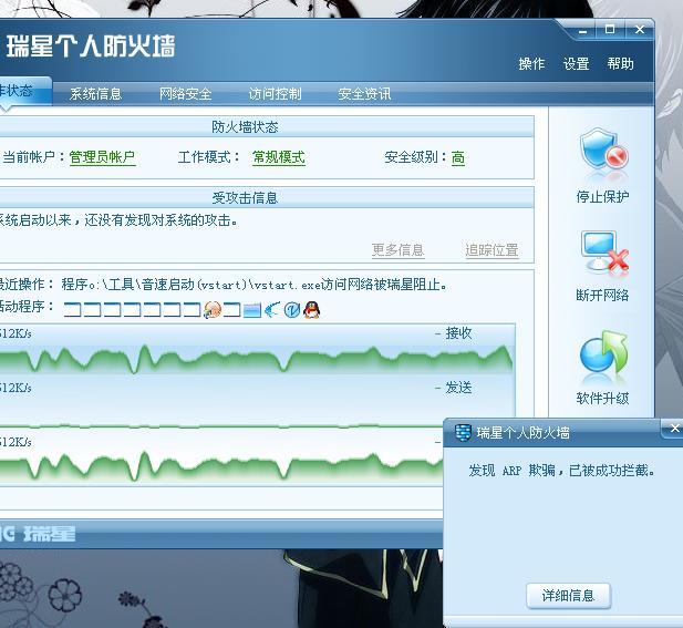 还有瑞星2009防终结者4.02在国产里面是最好的呢,不相信自己安装金山或江民,在终结者4.02的限制网速面前,只有瑞星的影响最少,其它的ARP防火墙基本防不了,我又看到国产的希望,实践说明事实,瑞星最不好的地方就是有很多个进程,不知道是怎么搞的.