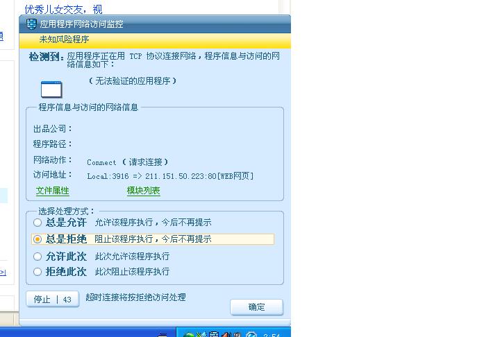 1.防火墙提示这个程序要求访问网络时,查看它的文件属性,却无法查询,显示未知属性(这个是借用某人的图片。。。)