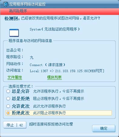 基本只要我的IE一连接网络他就跳出来,而且IE经常连接不上网页,就连上个GOOGLE都要刷新好几次才出来,我是ADSL2M的网络,现在被我频繁拒绝以后,现在"程序路径"变成空白的了,"文件属性"空白,"模块列表"空白
