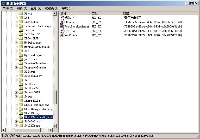 刚检查了一下注册表,发现[HKEY_LOCAL_MACHINE\SOFTWARE\Microsoft\Windows\CurrentVersion\ShellServiceObjectDelayLoad]这个项打开报错,提示开起机器码时发生错误,是不是跟这个有关系,如果是要怎么修复