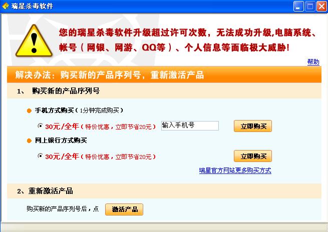 这是为什么呢?谁能给我个解释,我的电脑只有我自己用,序列号谁也没给,凭什么我就要再次购买新的产品序列号,重新激活产品,之前的钱就不是钱吗?你们瑞星就是这样收费的吗?