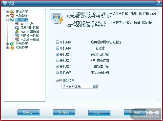 B、点击『瑞星全功能安全软件』或『瑞星个人防火墙』主界面『设置』菜单-切换到『网络监控』选项卡,如下图,勾选“开机启用”『恶意网址拦截』功能。