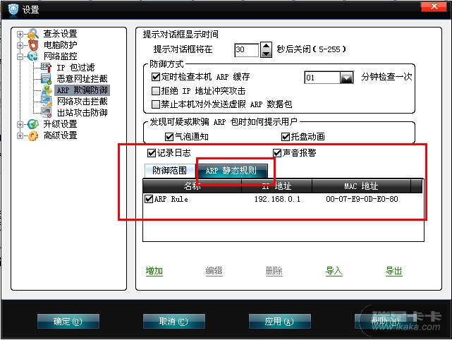 、打开防火墙,设置,详细设置,arp欺骗防御,启用arp欺骗防御。