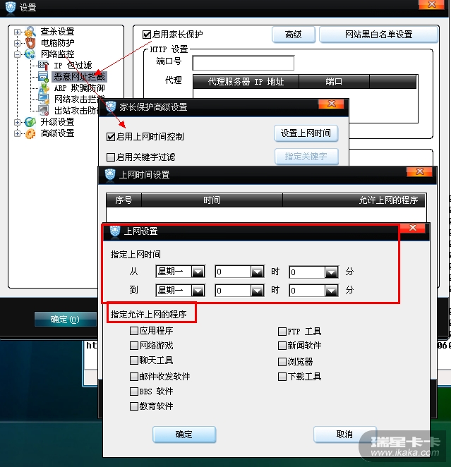 高手们请帮帮忙…………请问瑞星个人防火墙设置:网络监控→恶意网址拦截→启用家长保护里面怎么设就只能上QQ的呀????????