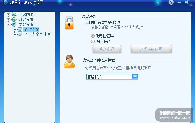 为什么我的瑞星个人防火墙在软件安全里不能设置密码和更改启动模式,改过后再进入设置又回到以前了,没有变如下图: