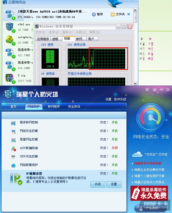 2.当下载与防护同时工作时,CPU狂飙,电脑狂卡: