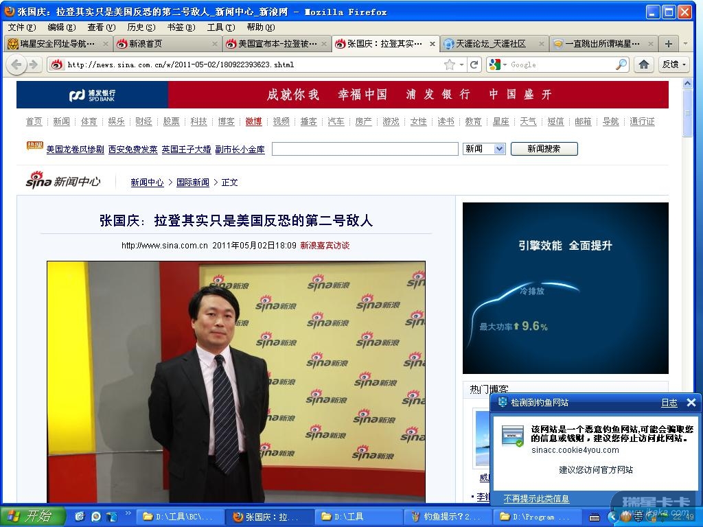 我现在都用瑞星安全网址导航打开网站,目前网易打开就提示发现钓鱼网站,新浪和搜狐是点开部分新闻就跳出提示,天涯也是如此,我用瑞星全面杀毒,同时也用卡卡扫描了,都没发现电脑有病毒和木马。版本号23.00.19.23
