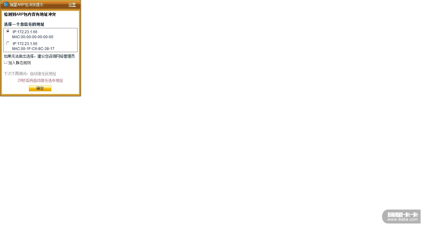 瑞星检测到ARP包内容有地址冲突怎么办,不断弹出