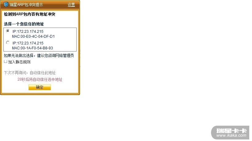 回复:瑞星检测到ARP包内容有地址冲突怎么办