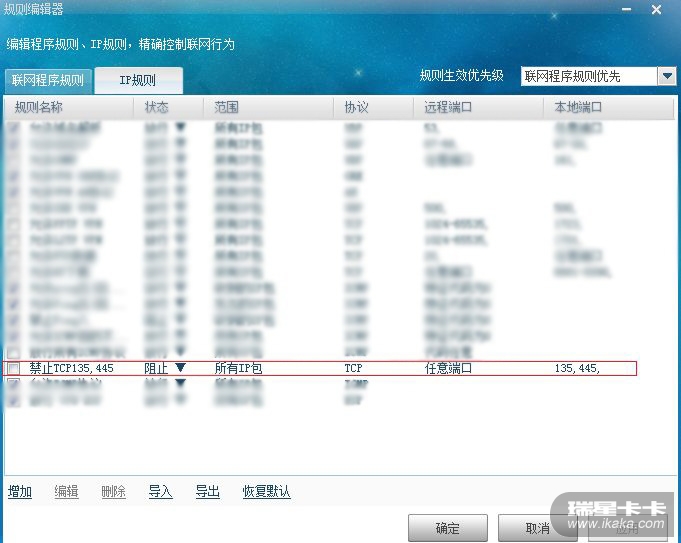 默认应该是前面没有打钩,状态显示为“阻止”“所有IP包”,远程端口为任意,本地端口135,445