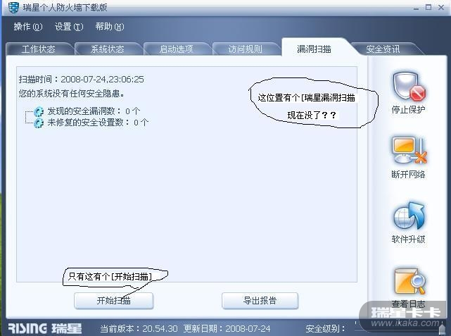 今天打开瑞星防火墙准备扫描下漏洞,发现:光是底下部分的开始扫描,框内右上角的漏洞扫描没了,也打不开另一个扫描界面!